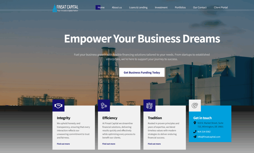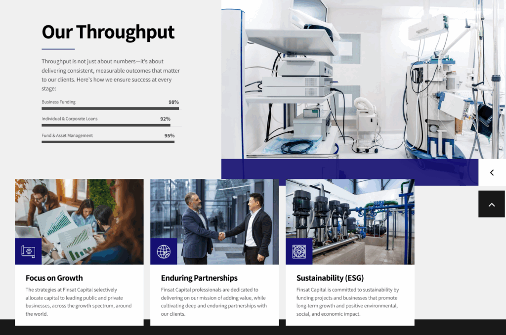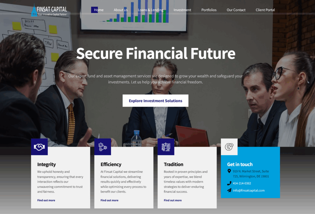 Directly visible: clear value proposition, animated KPIs (e.g. assets under management, customer satisfaction), trust elements (e.g. SEC compliance), and testimonials in slider format.